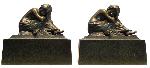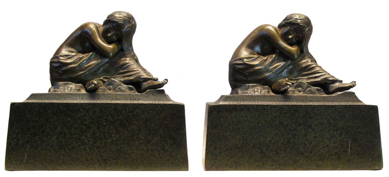 (6.75 x 3.75 x 6.5 inches). 12 pounds the pair. Gray metal figures with a warm bronzed finish, on iron bases. Some rubbing and minor finish loss, one figure slightly loose but still firmly attached. A stunning pair.