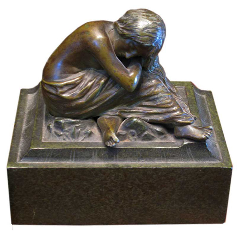 The original paper tag (not present) read: "A goddess who was proud of her numerous family, six daughters and six sons. She boasted of her superiority to her friend Leto (goddess) and the mother of only two children, Apollo and Artemis. As a punishment Apollo slew her sons and Artemis her daughters. Their bodies lay for nine days unburied for Zeus has changed the people to stone. On the tenth day they were buried by the gods. Out of pity for her grief the gods changed Niobe herself into a rock. In which form she continued to weep."