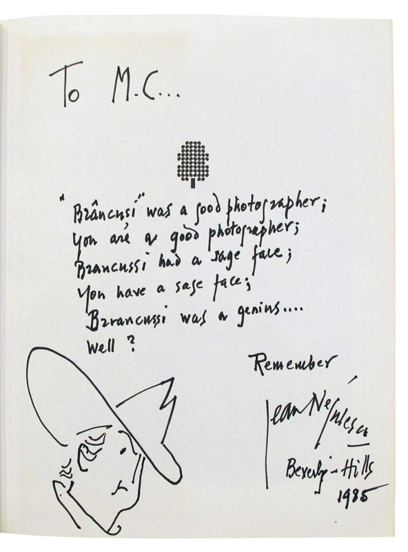 Quarto. 317 pp., including numerous black and white illustrations. Quarter burgundy cloth over green boards, with original dust jacket. Very mild rubbing to extremities, one quarter inch closed tear to top edge of jacket, but still a near fine copy. Signed with a lengthy inscription and original drawing by the author: "To M.C... / 'Brâncuşi' was a good photographer; / You are a good photographer; / Brancussi [sic] had a sage face; / You have a sage face; / Brrancussi [sic] was a genius.... / Well? / Remember / Jean Negulesco / Beverly Hills / 1985".