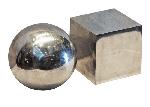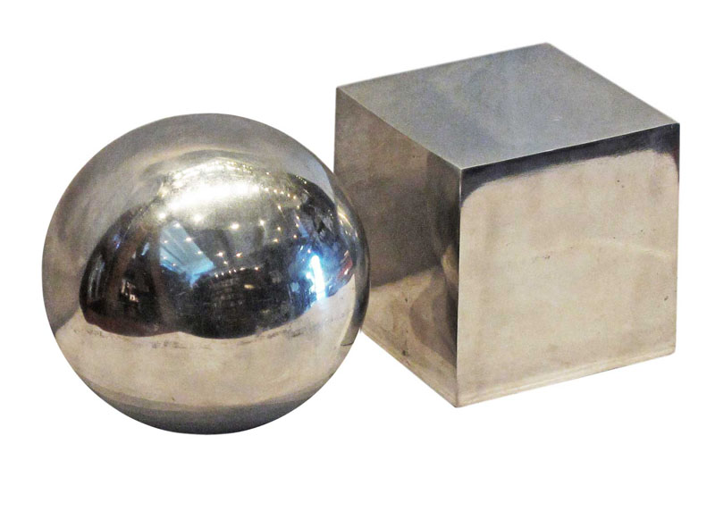(4" cube and 5" diameter sphere). Approximately 8.5 pounds the pair. Metal. Some rubbing to finish, but still very good.