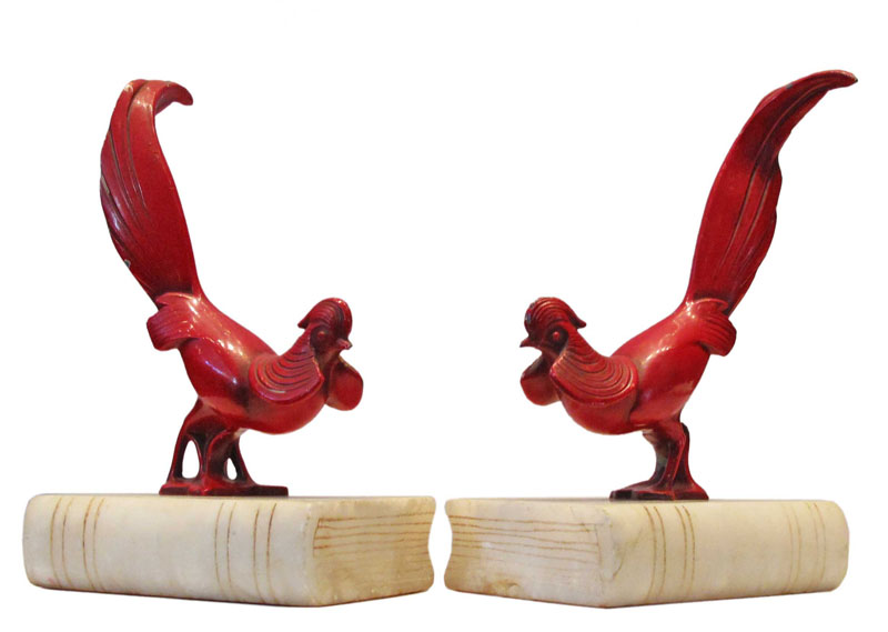 (4.5 x 7.25 x 3.25"). Nearly six pounds the pair. Gray metal on marble bases shaped like books. A few minor dings and chips to finish, but still very good.