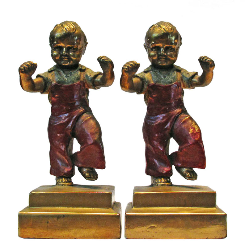 (8.25 x 3.5 x 2.75") Just over 4 pounds the pair. Bronze-clad, polychrome. Both signed Chas Jennings, Armor Bronze, with original felt and label. Some rubbing and finish loss, but still very good.