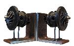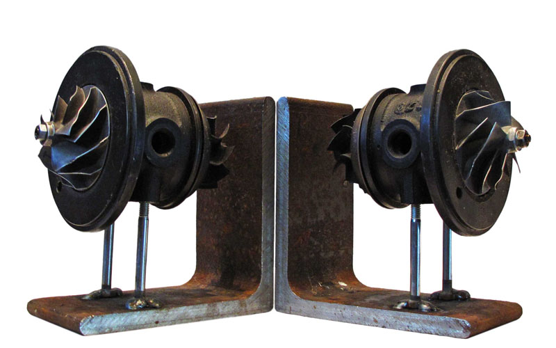 (5 x 6 x 4"). Nearly 12 pounds the pair. Metal alloy turbos welded to iron bases. One signed on the back, presumably by the maker.