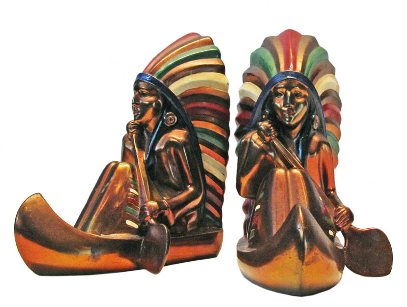 (6.5 x 6 x 3.5"). Just under 6 pounds the pair. Gray metal, polychrome. Minor rubbing and finish loss, one has a crack to base, but still a very good set.