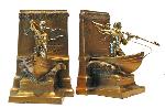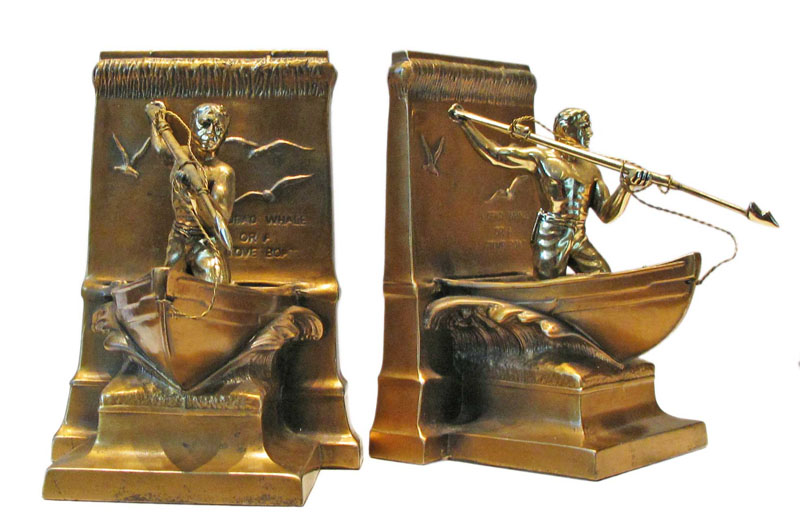 The back of these wonderfully sturdy bookends reads: "In honor of the whaleman whose skill hardihood and daring brought fame and fortune to New Bedford and made its name known in every seaport of the globe". Modeled after a sculpture designed by Bela Lyon Pratt which stands now in front of the New Bedford Library.