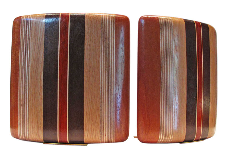 (7.25 x 7 x 4"). Solid wood, including Peruvian walnut and African padauk, with brass base and original cork bottoms.
